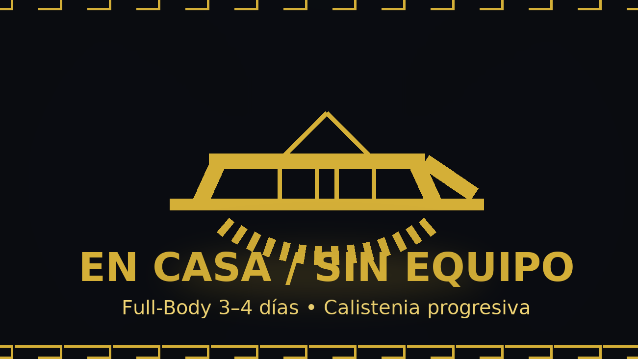 Frecuencia: L–X–V (o Ma–J–S) · RIR: 1–2 · Descansos: 60–90 s en accesorios, 90–120 s en compuestos calisténicos.